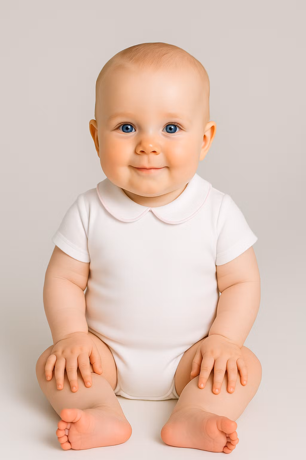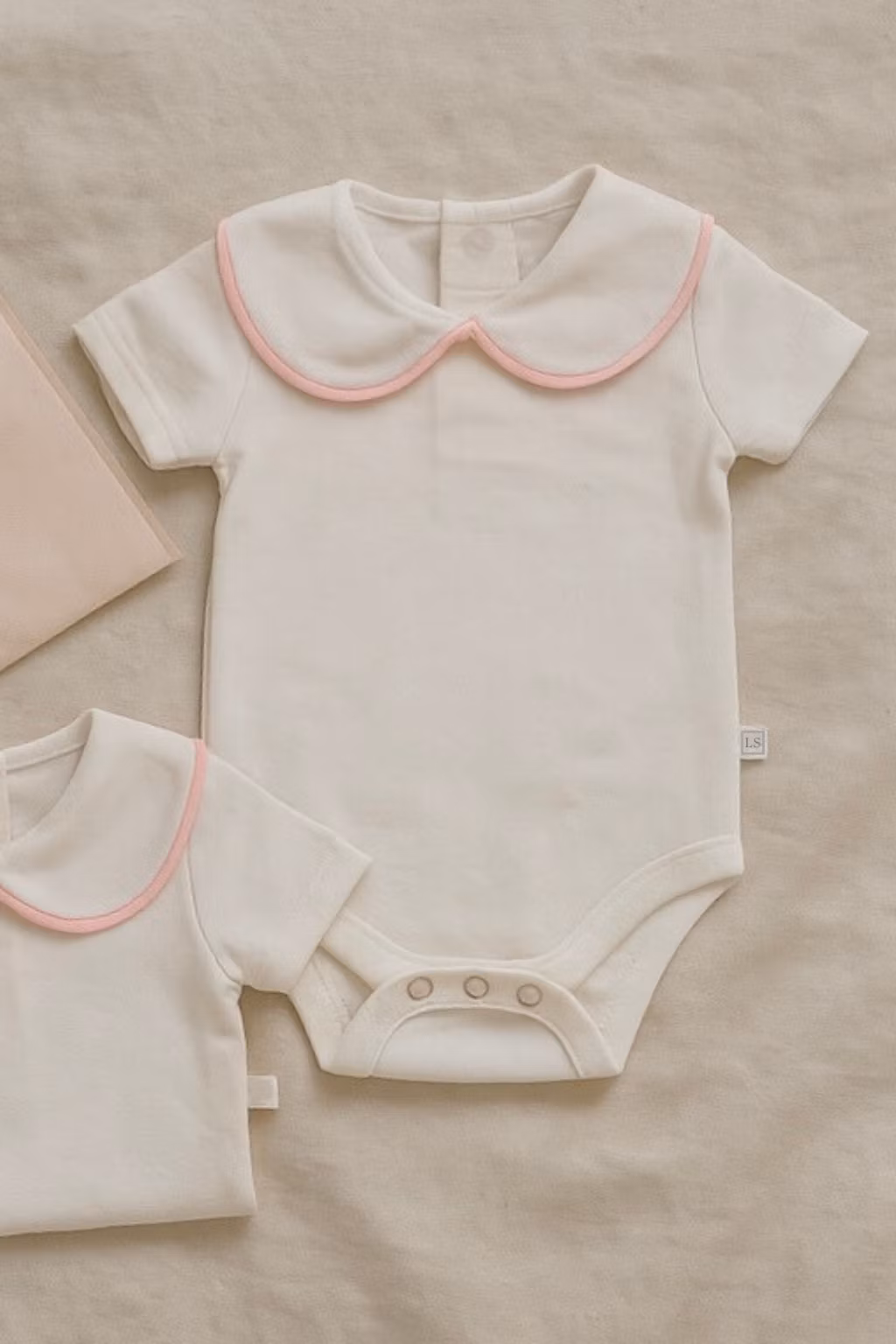 Kortärmad babybody i 100% ekologisk bomull med rosa krage. Personlig brodyr ingår – en mjuk och meningsfull gåva för bebisar. Babykläder med namn.